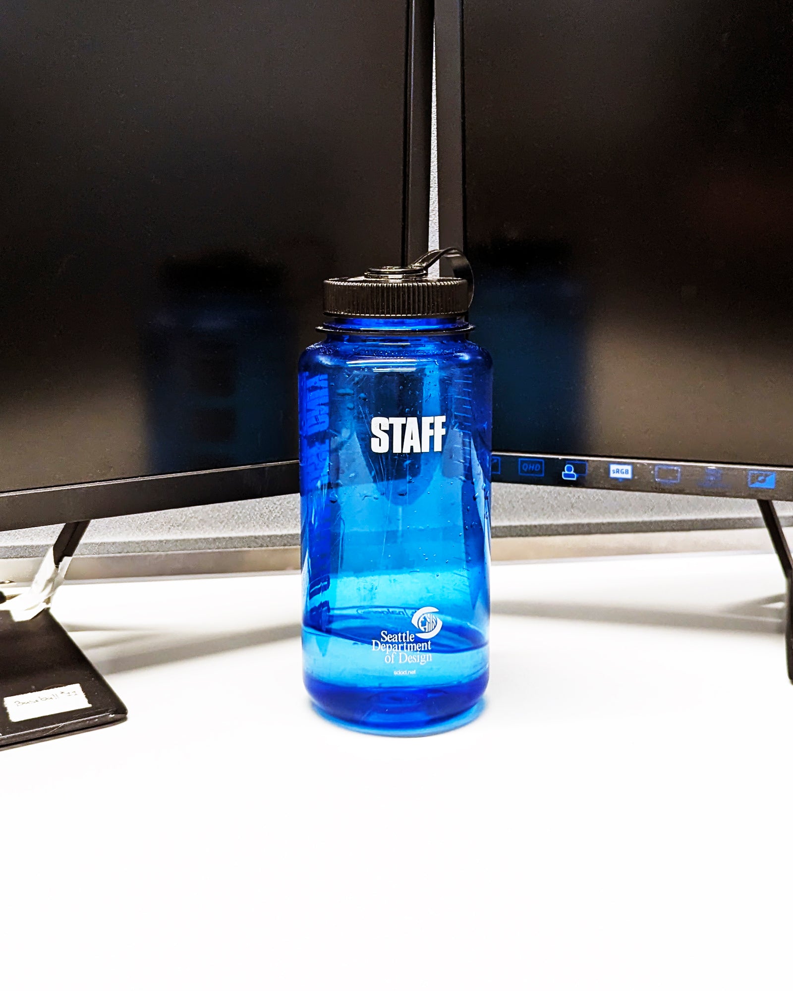 Our definition of "staff" is loose—anyone who believes in the same things we do is one of us! At that means our definition of "official use" is equally flexible. Whether you're appreciating a sign around town, the colors of a bus or a fun structural detail on a skyscraper, you're doing official SDoD work. So make sure you've got this lovely blue drinking vessel on hand at all times!