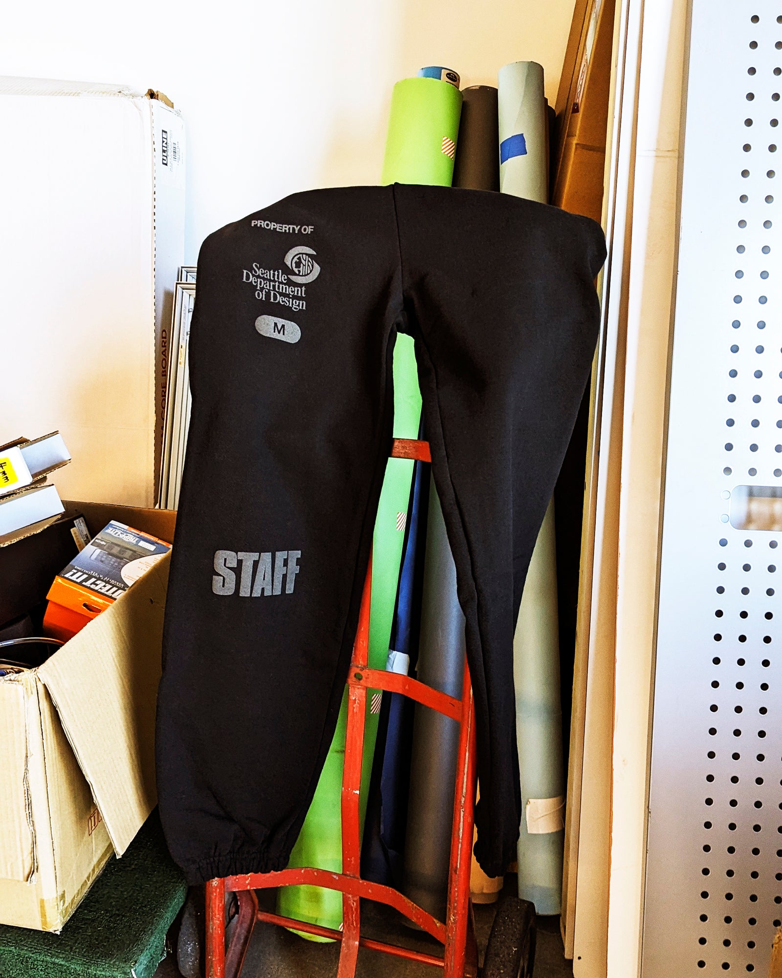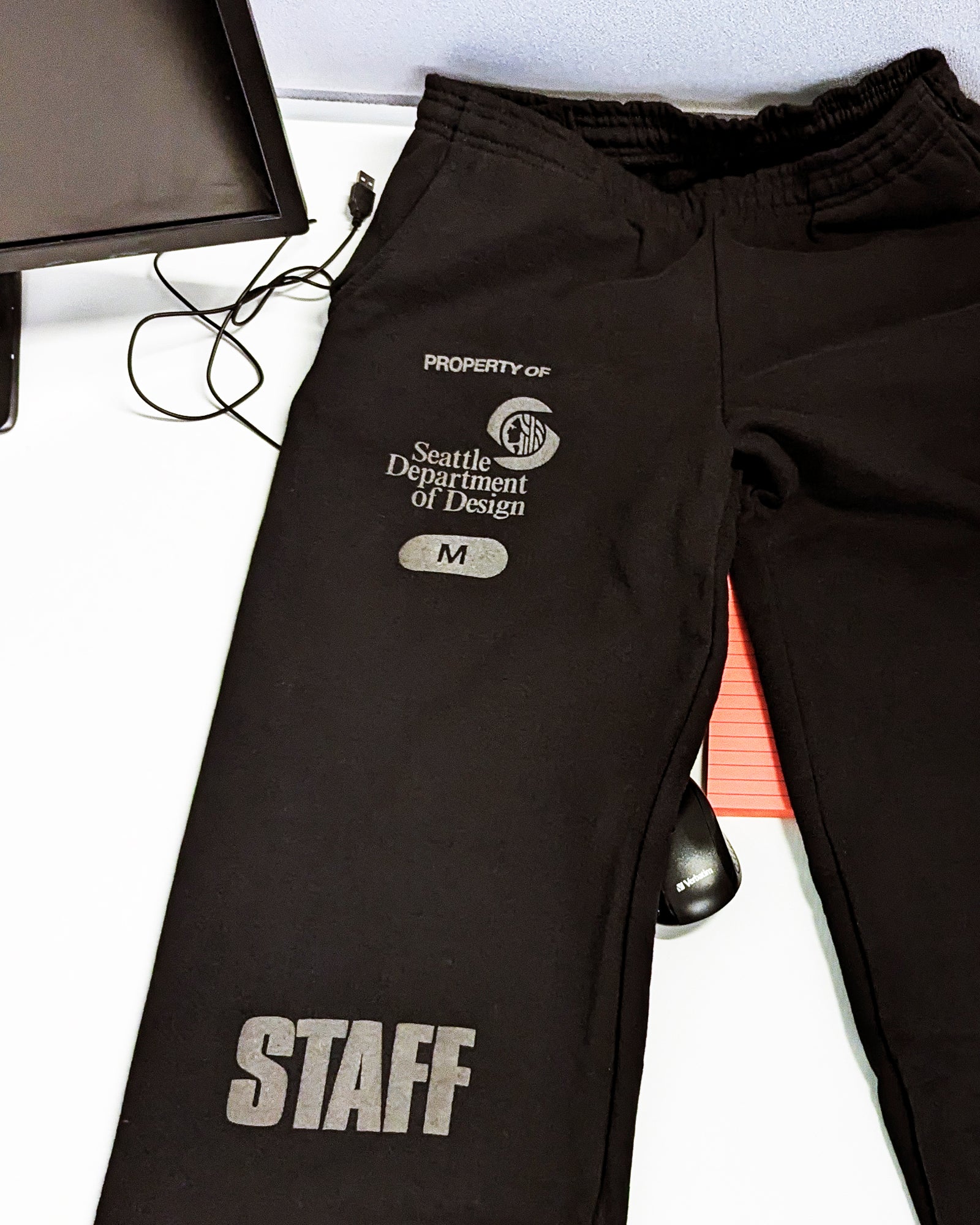 - These sweatpants are made of a beefy cotton fleece, and feature our logo, a size tag and a big old "STAFF" on the front. All were printed in a rare grey puff print, the last of an ink created by a now-defunct Kent company run by an old Boeing engineer.