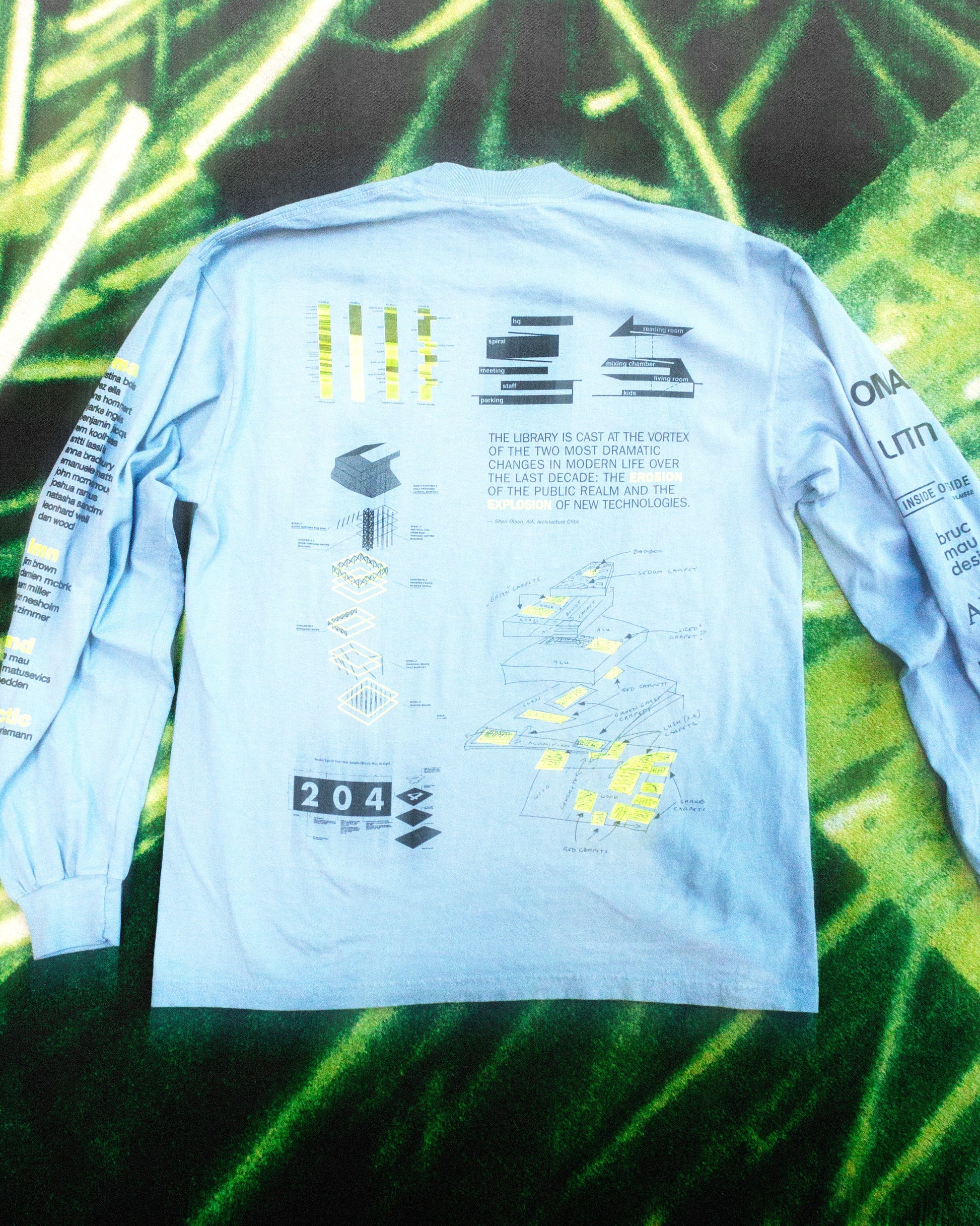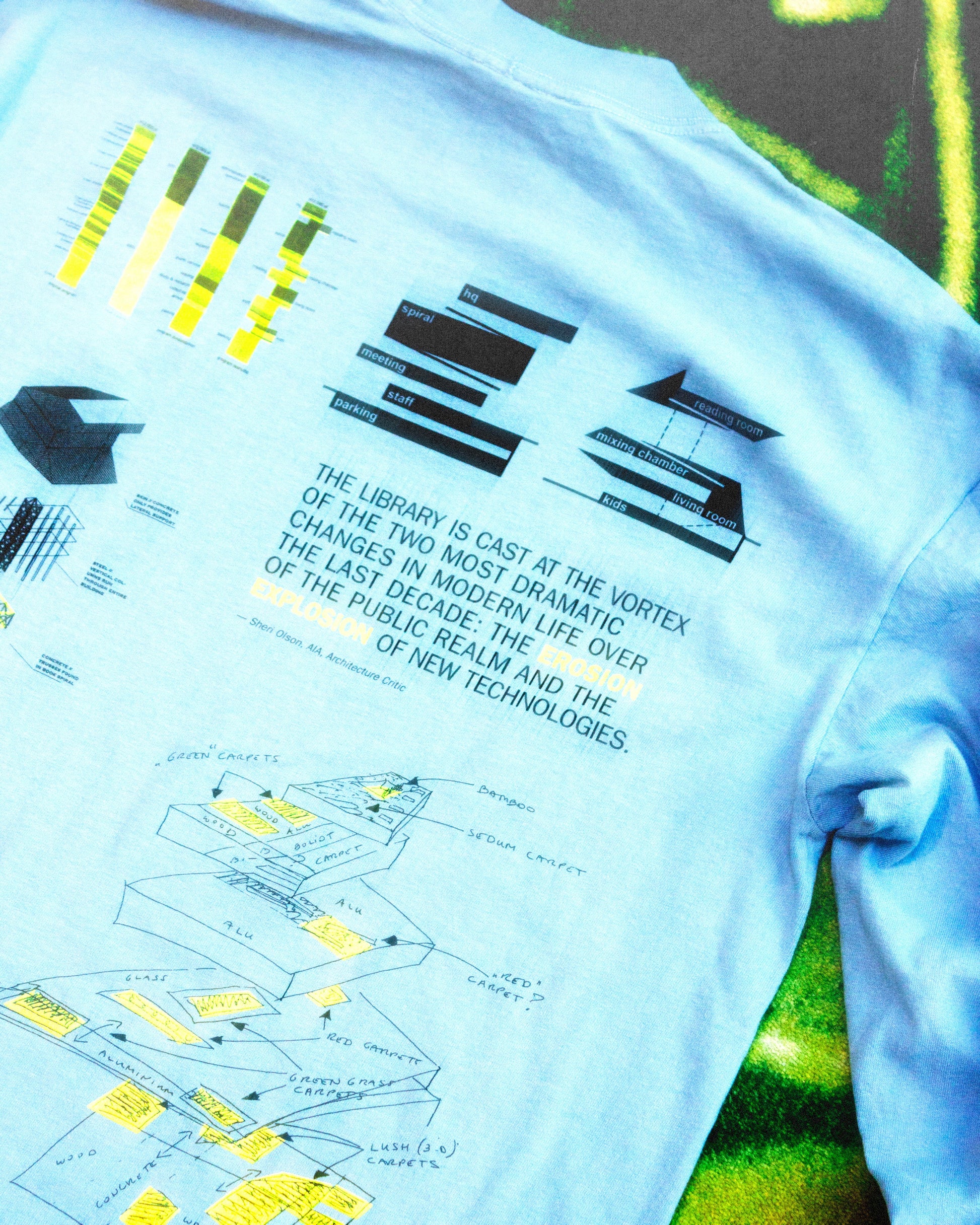 - This shirt features everything that went into the Central Library: the firms that worked on it, the words written about it and its design and construction. The tee's color is reminiscent of the library's steel structure and its pops of neon echo the bright escalators that transport people from floor to floor.