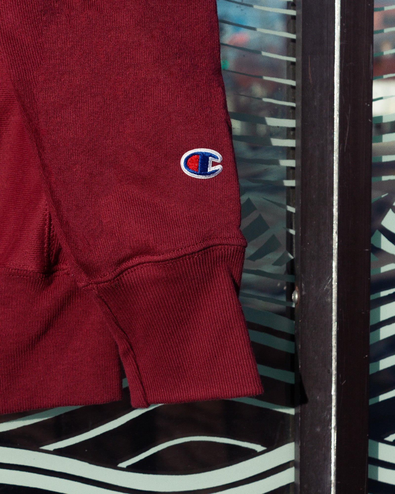 - Printed in Seattle on Champion Reverse Weave. 82% cotton, 18% polyester. Fits on the bigger side, size down for a snugger fit.