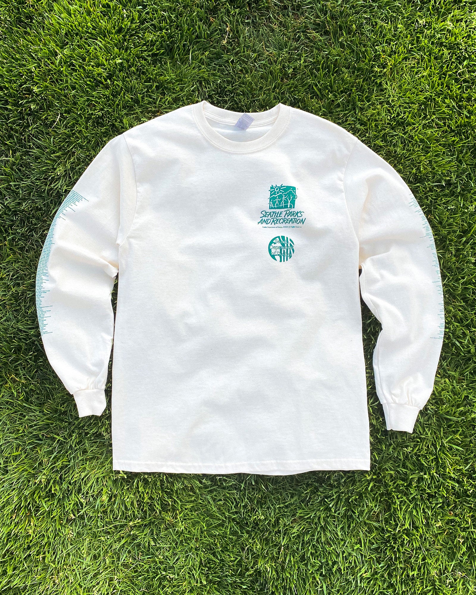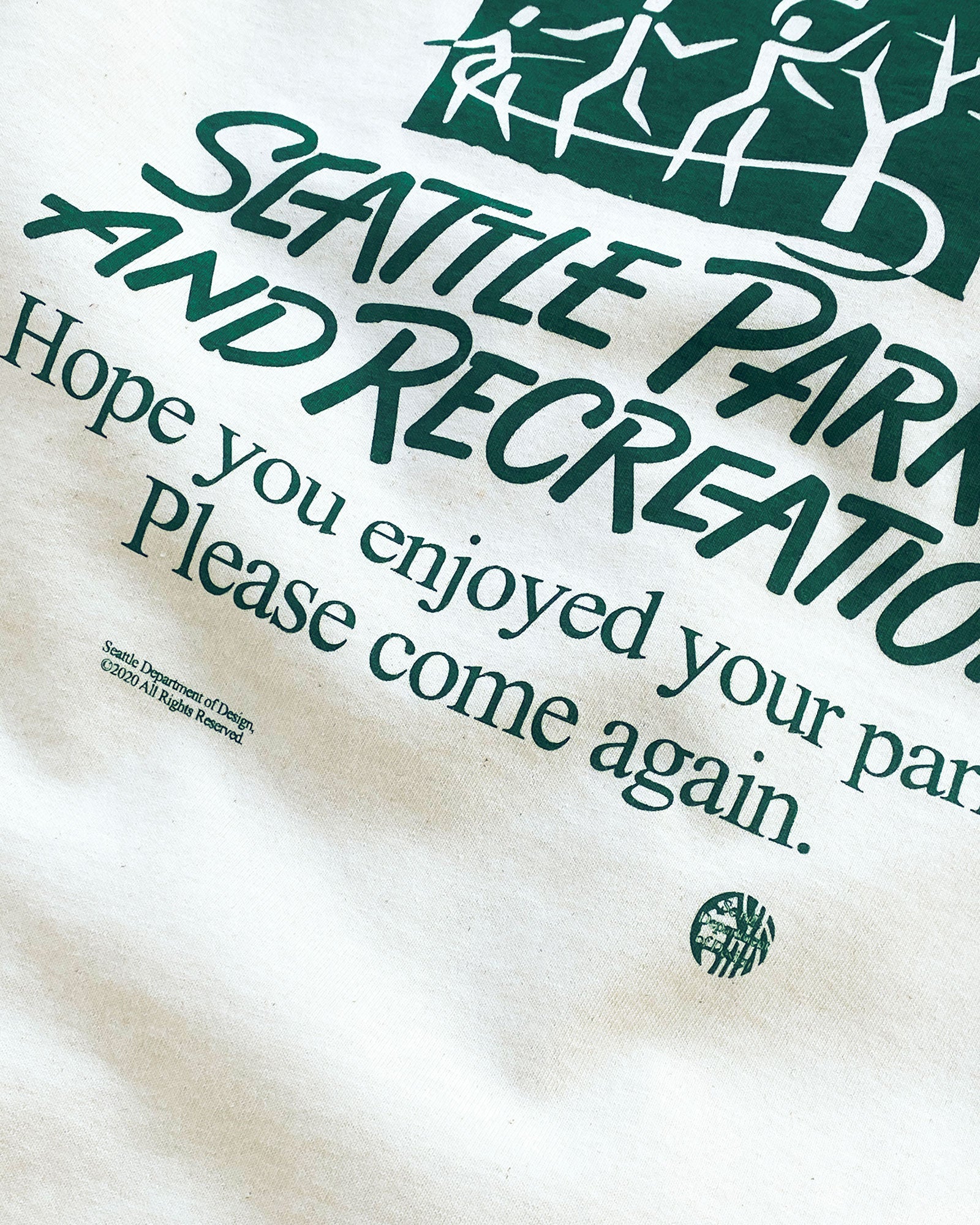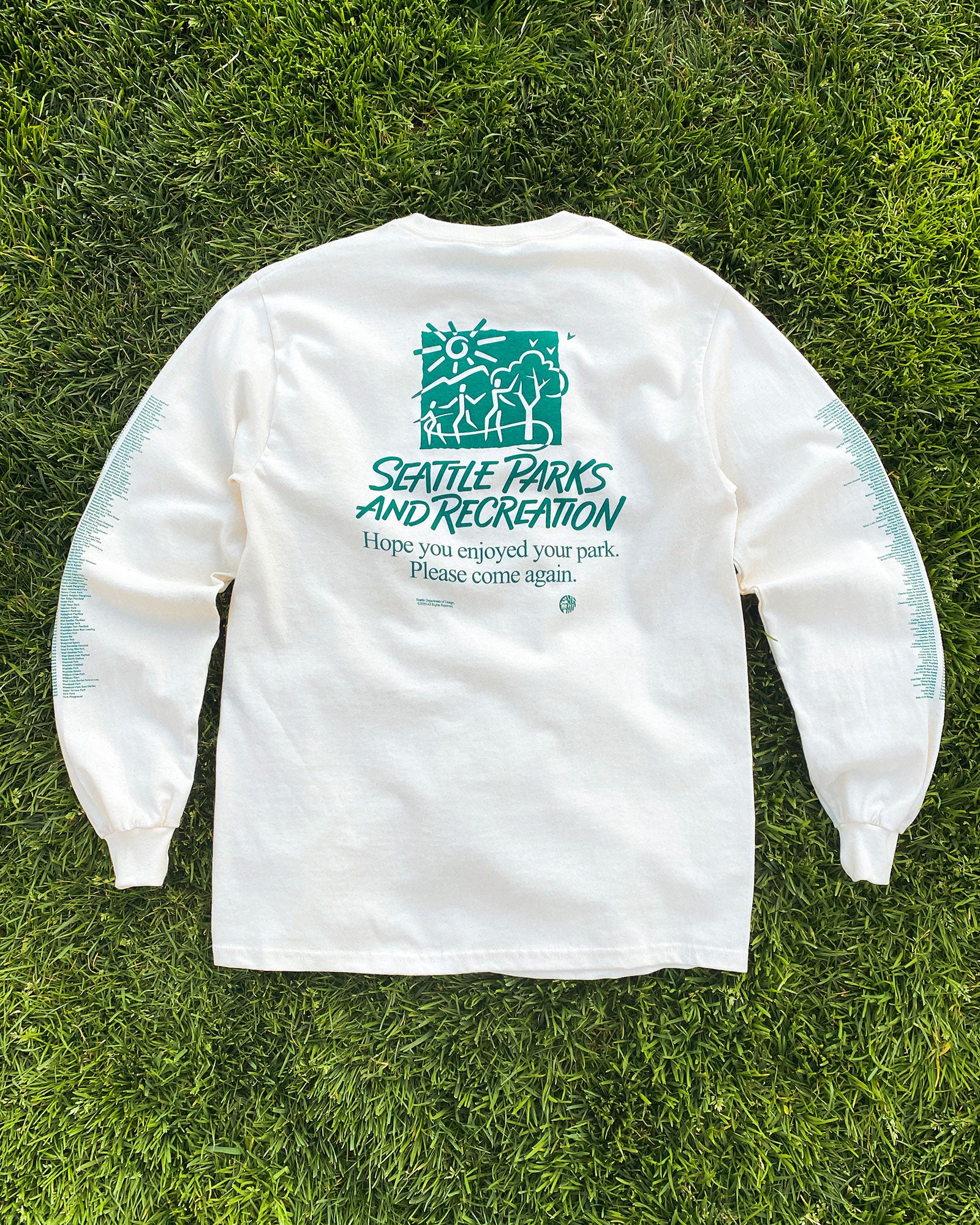 This is a shirt we've always wanted to find at Goodwill but never seem to be able to. Printed in green ink on a natural-colored tee, this shirt features the names of every Seattle park and playfield on either sleeve. The back of the shirt features the Seattle Parks and Recreation logo and the department's slogan. A slogan that reminds us who city parks belong to, and how integral they are to our civic life. Each tee comes with free SDoD logo stickers.