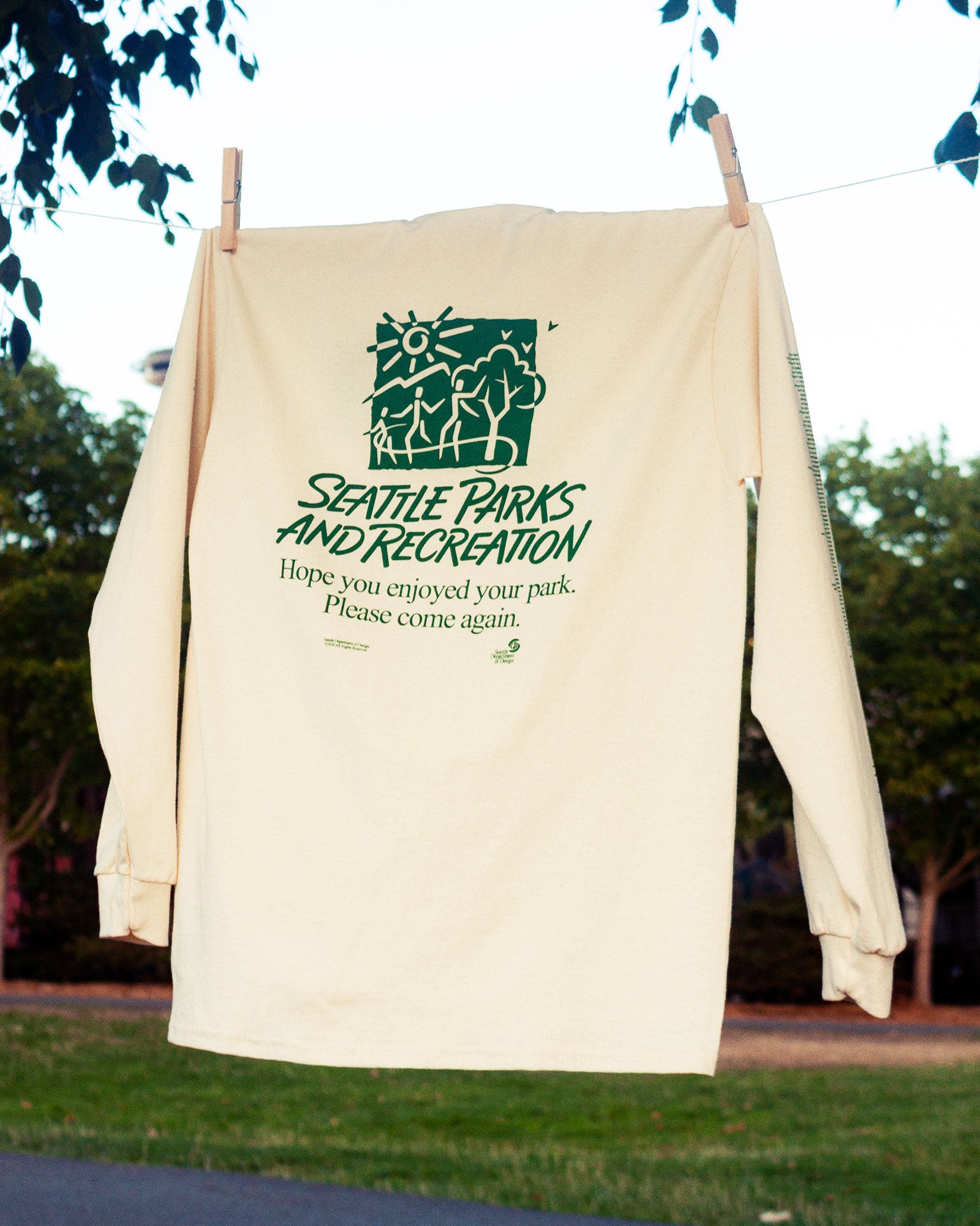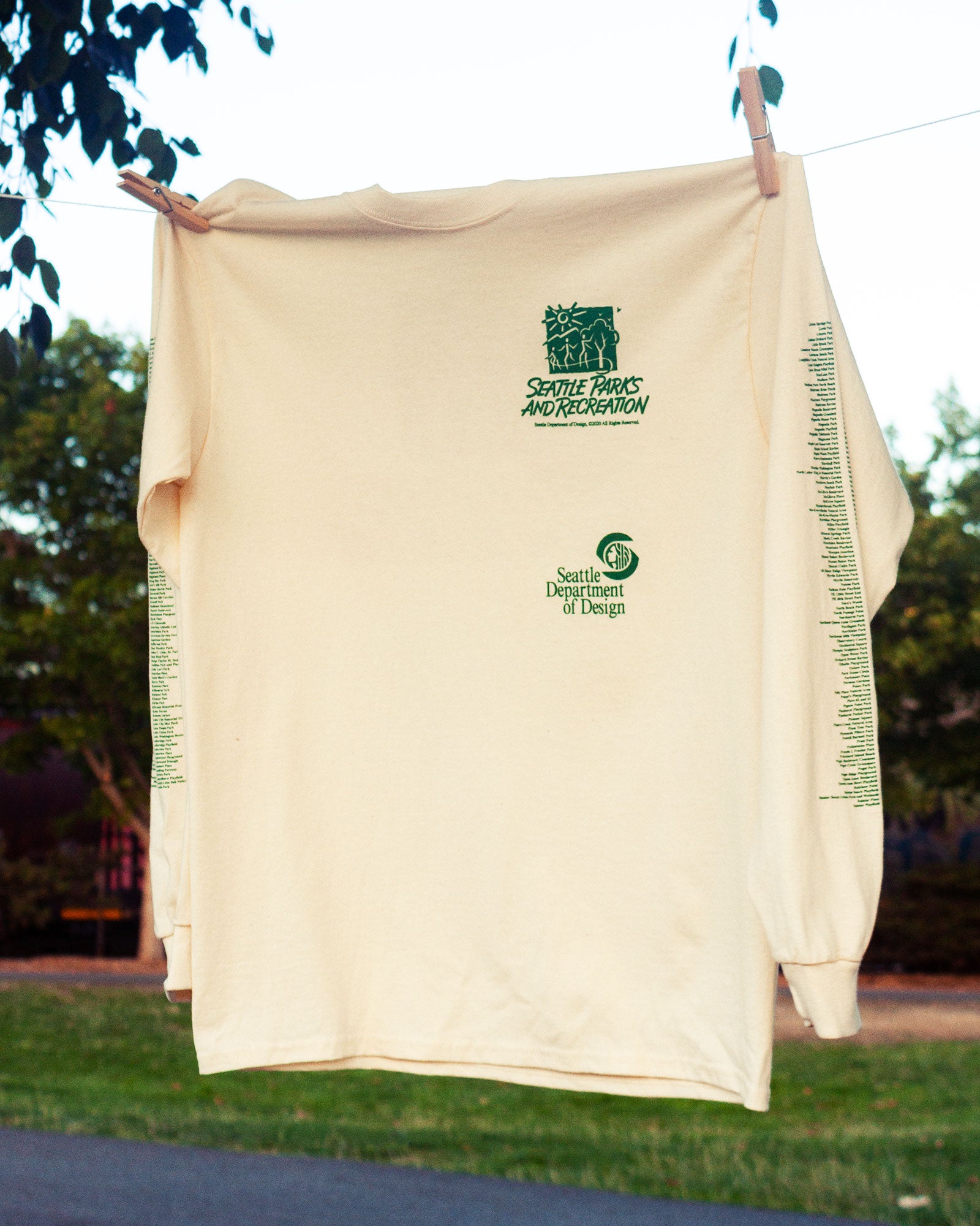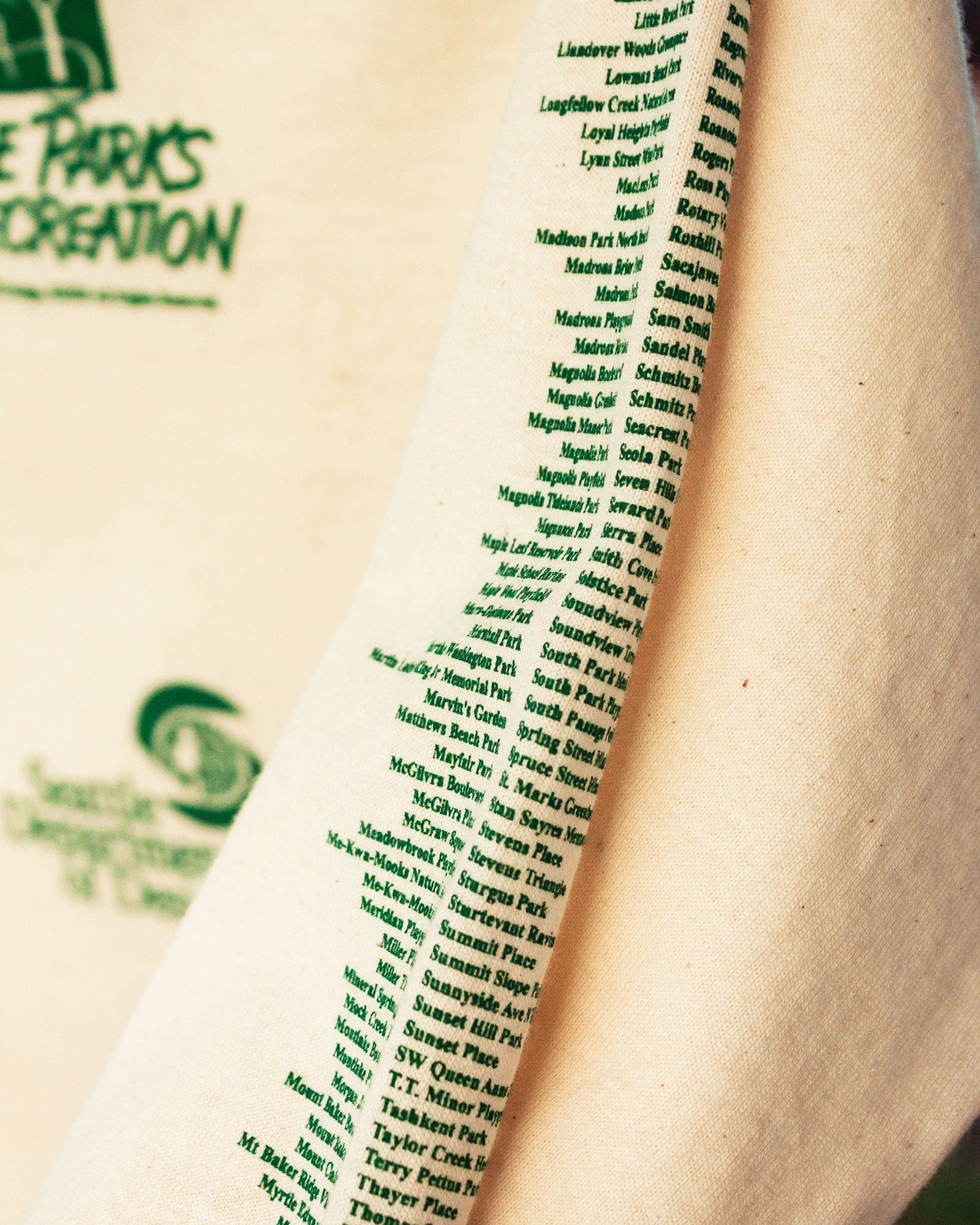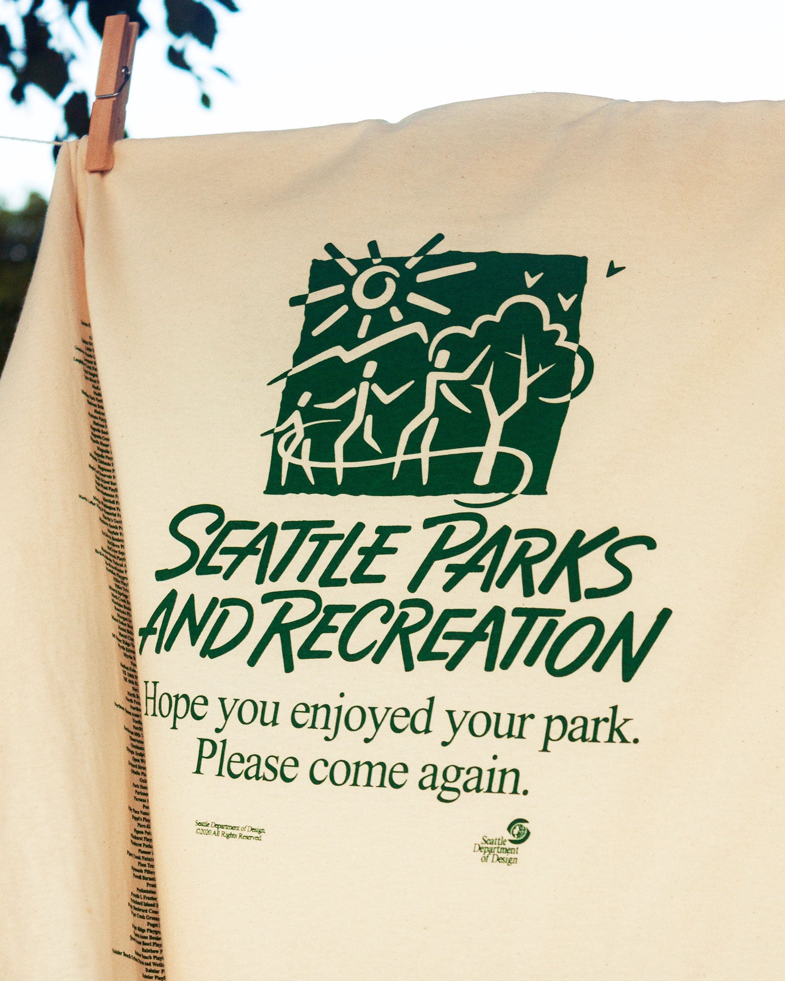 - This is a shirt we've always wanted to find at Goodwill but never seem to be able to. Printed in green ink on a natural-colored tee, this shirt features the names of every Seattle park and playfield on either sleeve. The back of the shirt features the Seattle Parks and Recreation logo and the department's slogan. A slogan that reminds us who city parks belong to, and how integral they are to our civic life.
