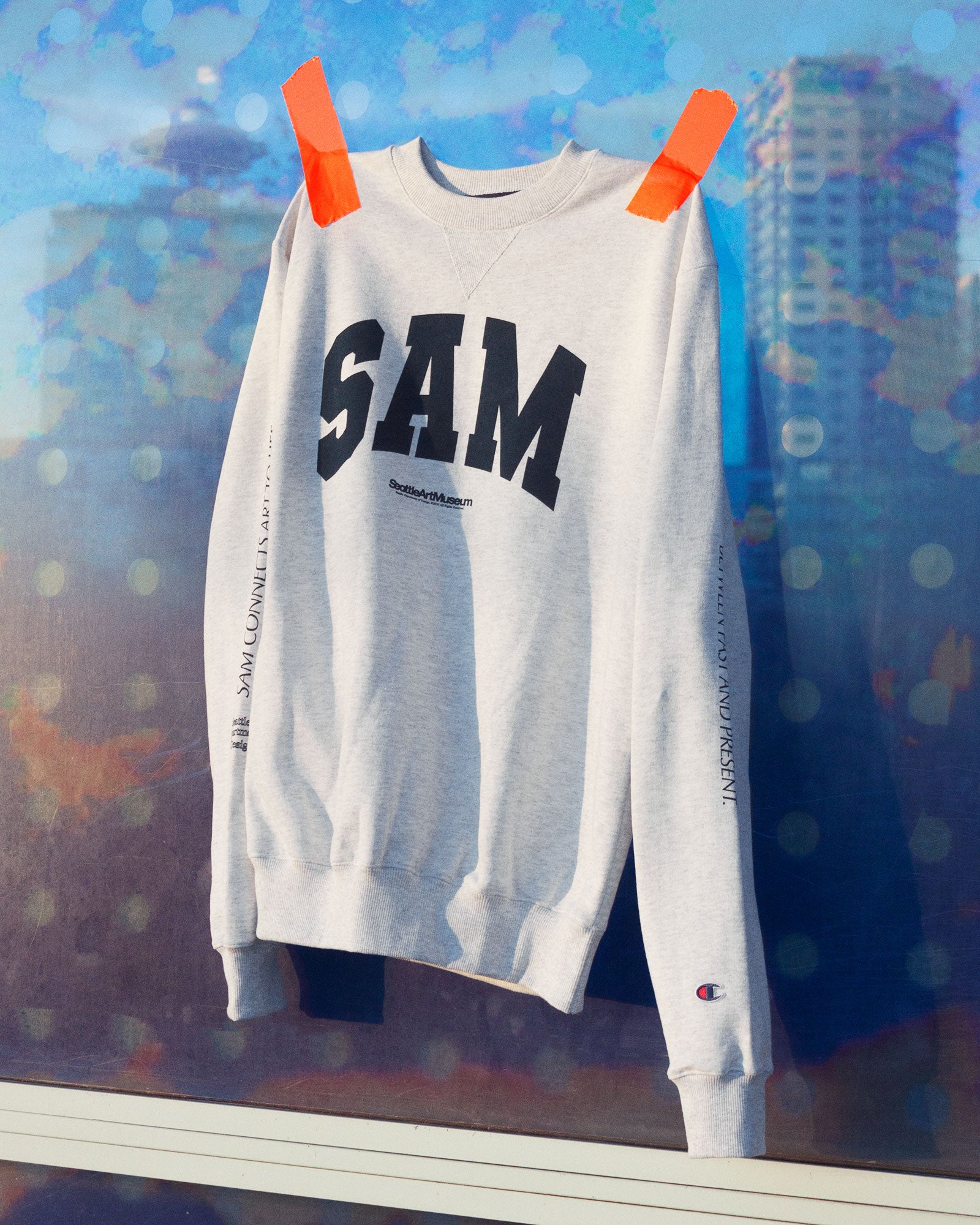 Regardless, we at SDoD felt it was high time our local institution got a similar treatment. Using a collegiate blue ink on a grey Champion Cotton Max crew neck, these sweaters sport prints on the chest and sleeves. Up front is a varsity interpretation of the museum's name, along with the SAM's Helvetica logo from the 1980s. The sleeves feature two sayings often used in annual reports and marketing materials from the institution: "Exploring Dynamic Connections Between Past and Present" and "SAM Connects Art to Life."