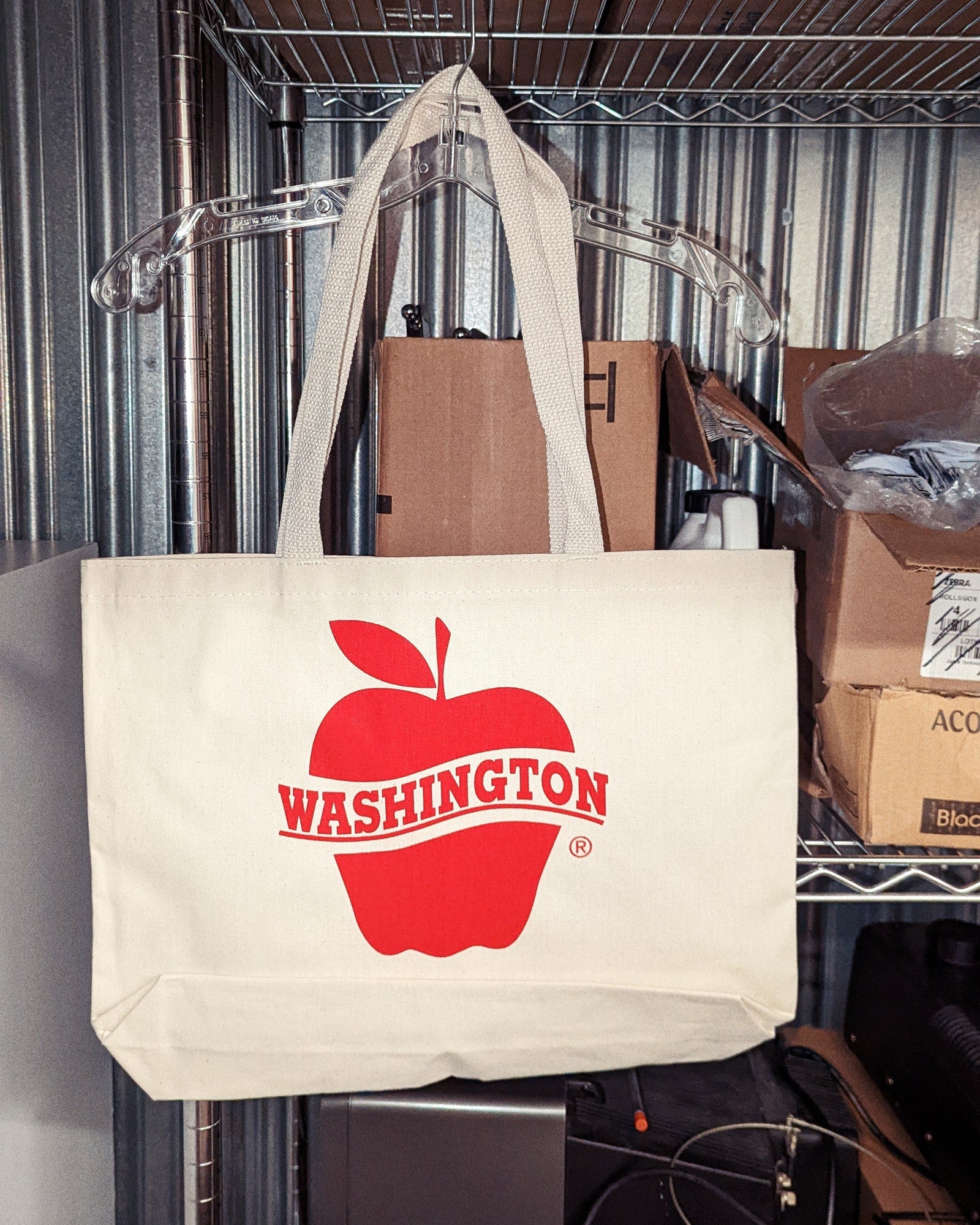 This tote is made of a hardy natural cotton canvas, with apple-red ink graphics on either side. One side features the iconic logo of the WAC, the other this slogan in a wonderful script.